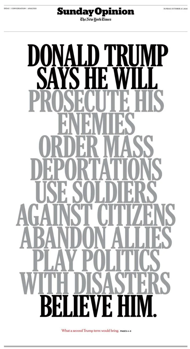 This is not a joke. This was the actual opinion page of the NYT on Sunday. These despicable lying fucks have been peddling false narratives, misinformation, disinformation and outright lies about Trump, on behalf of the CIA and Deep State for the last eight years, and they have the balls to print this drivel. No wonder their readership is at all-time lows, they lose millions of dollars, and most people wouldn’t even line their bird cage with this tripe.