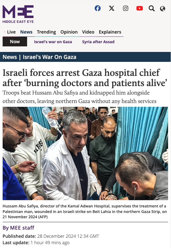 Israeli forces detained the director of Kamal Adwan Hospital, Dr Hussam Abu Safiya, after setting the health facility in northern Gaza on fire with doctors and patients inside, according to health officials.