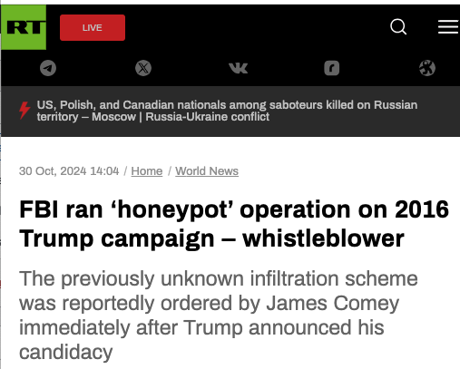 Comey’s operation took place a year before the FBI’s ‘Crossfire Hurricane’ investigation into the Trump campaign’s alleged contacts with Russia, which later morphed into Special Counsel Robert Mueller’s two-year ‘Russiagate’ probe. According to the whistleblower, the honeypot operation was kept “off the books” to conceal it from the US Justice Department’s inspector general, who later determined that Comey knowingly lied when submitting evidence to obtain a warrant to surveil Trump’s campaign.