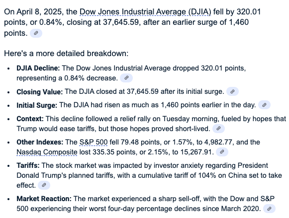 BEAR MARKET WATCH! The DJIA fell by 320.01 points on Tuesday, April 8, 2025
