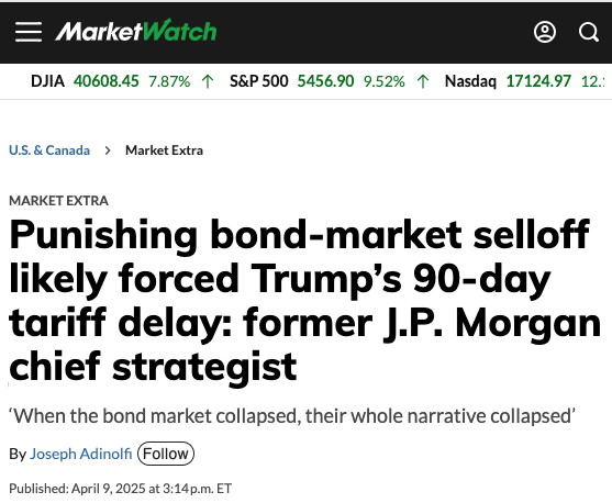 Kolanovic told MarketWatch on Tuesday evening that he believed the administration was close to walking back some of the tariffs announced last week. His call proved prescient: On Wednesday afternoon, Trump announced a 90-day pause on tariffs for all countries that hadn’t retaliated against the U.S., while also raising levies on Chinese goods to 125%.
