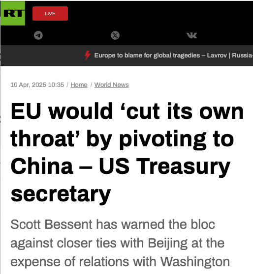 EU would ‘cut its own throat’ by pivoting to China – US Treasury Secretary [So say the soyboy married to a male wokester]