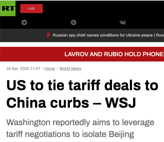 The US plans to use tariff negotiations to push trade partners to scale back economic ties with China, the Wall Street Journal reported on Tuesday, citing sources familiar with the talks. The strategy is reportedly aimed at securing commitments from countries hit by recent US tariff hikes to help isolate China’s economy and pressure Beijing to negotiate.