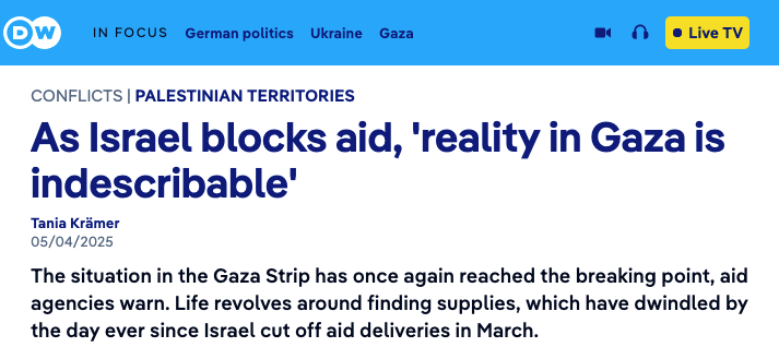 READ HERE: https://www.dw.com/en/as-israel-blocks-aid-reality-in-gaza-is-indescribable/a-72424450