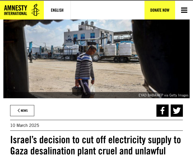 “Israeli authorities must immediately and fully restore Gaza’s electricity supply – not only to the desalination plant – and allow civilians unfettered access to essential goods and services. As the occupying power, Israel has a legal obligation under international humanitarian law, to the fullest extent of the means available to it, to ensure the provision of food, medicine and other supplies essential to the survival of civilians in Gaza.”