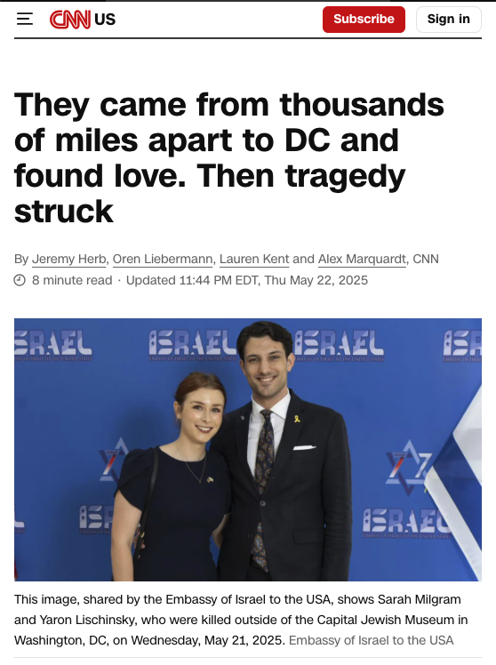 Those two Israeli staffers allegedly murdered by the alleged “Free Palestine” advocate may still be living … … … in Israel … just like MOSSAD blackmail and bribery artist Jeffrey Epstein currently is. In other words, they could both be crisis actors in the paid employ of MOSSAD for all anyone knows.