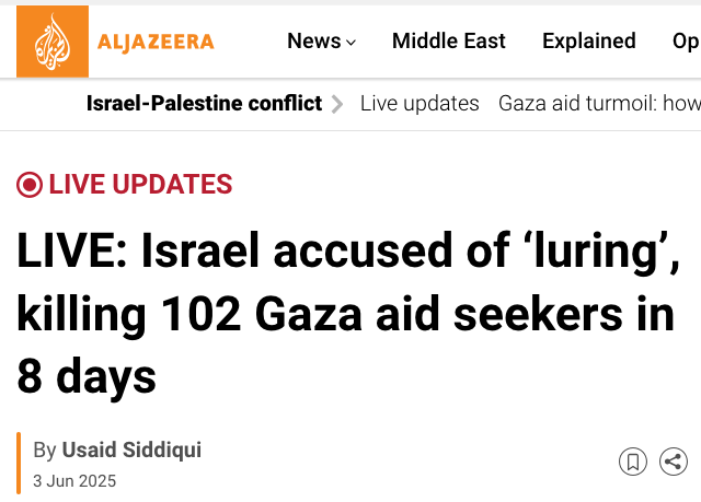 - Gaza’s Government Media Office has accused Israel of “a horrific, intentionally repeated crime”, saying it has lured starving Palestinians to aid centres run by the Gaza Humanitarian Foundation and killed 102 of them in the past eight days.