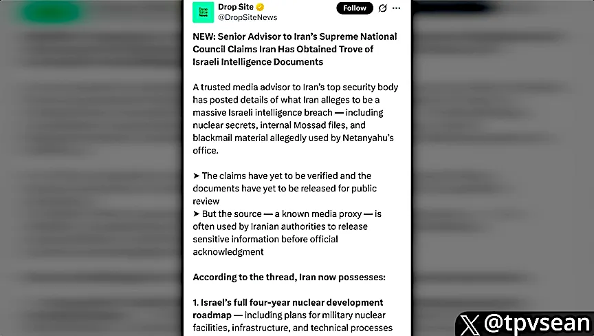 A trusted media advisor to Iran’s top security body has posted details of what Iran allages to be a massive Israeli intelligence breach – including nuclear secrets, internal Mossad files, and balckmail material allegedly used by Netanyahu’s office.