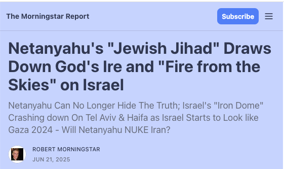 The dismal failure and the war crimes of Benjamin Netanyahu’s genocidal “Jewish Jihad” in Gaza in plain view of all the world, plus Israel’s sneak attack on Iran on June 13th 2025, coupled with the Collapse of Israel’s vaunted IRON DOME Defense is drawing down a wrathful “Fire from the Skies” on Israel and its people.