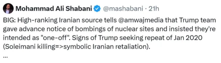 That means Iran appears to have gotten advance warning of the hit, which is interesting given the earlier Atlantic report that Trump had already ‘made up his mind’ precisely by Wednesday of this past week: