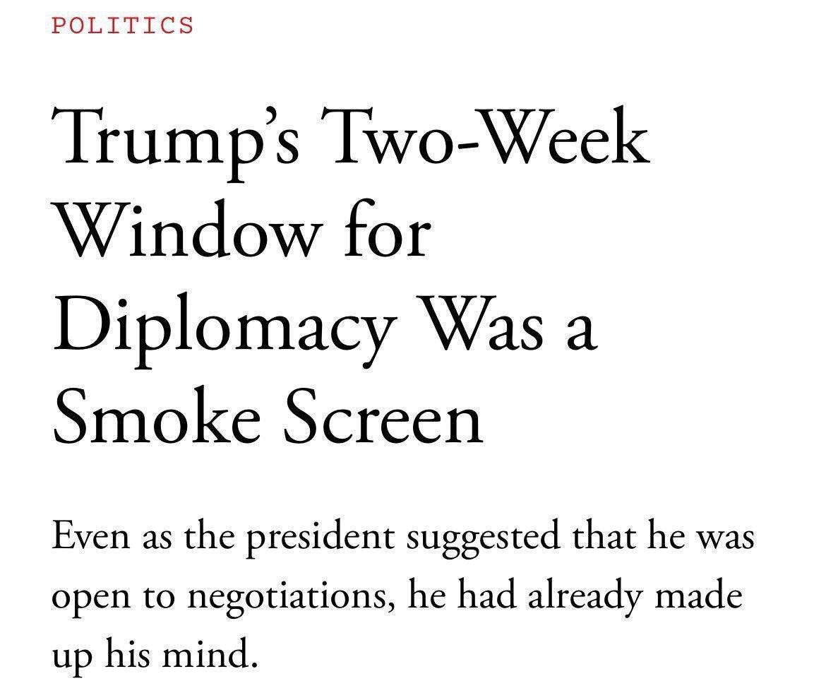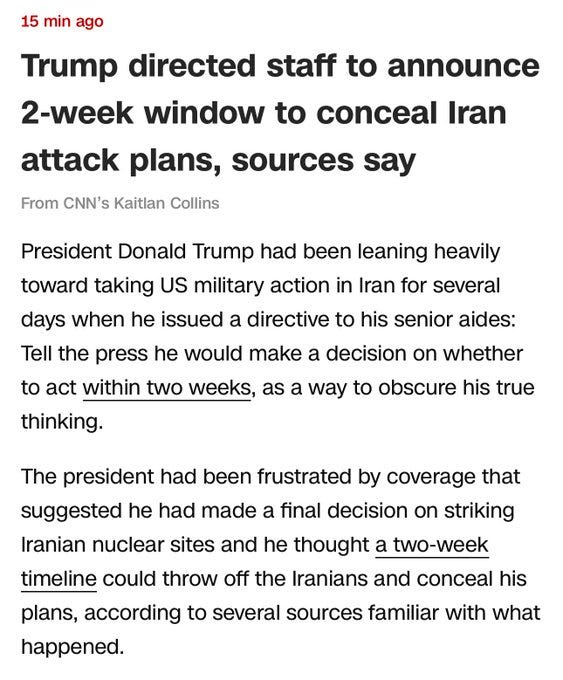 Well, Trump did it again: under cover of giving Iran “two weeks” negotiating time, he instead launched a covert attack as soon as the assets were in place, later telling ‘Meet the Press’ that he said he would make the decision within two weeks, and two days technically falls in that time scale.
