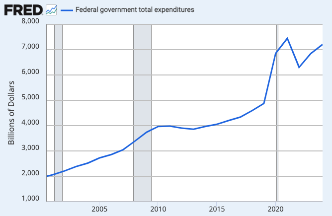 Take a look at annual federal expenditures since 2000 – see how the line consistently trends up, with higher highs and higher lows?
