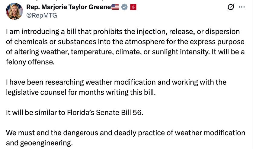 This week, Rep. Marjorie Taylor Greene (GA) announced on X she would be introducing a bold new federal bill that would make unauthorized weather modification and geoengineering a felony offense. The bill — co-sponsored by Rep. Tim Burchett (TN) — targets the unregulated release of substances into the atmosphere intended to alter weather, temperature, or sunlight intensity.