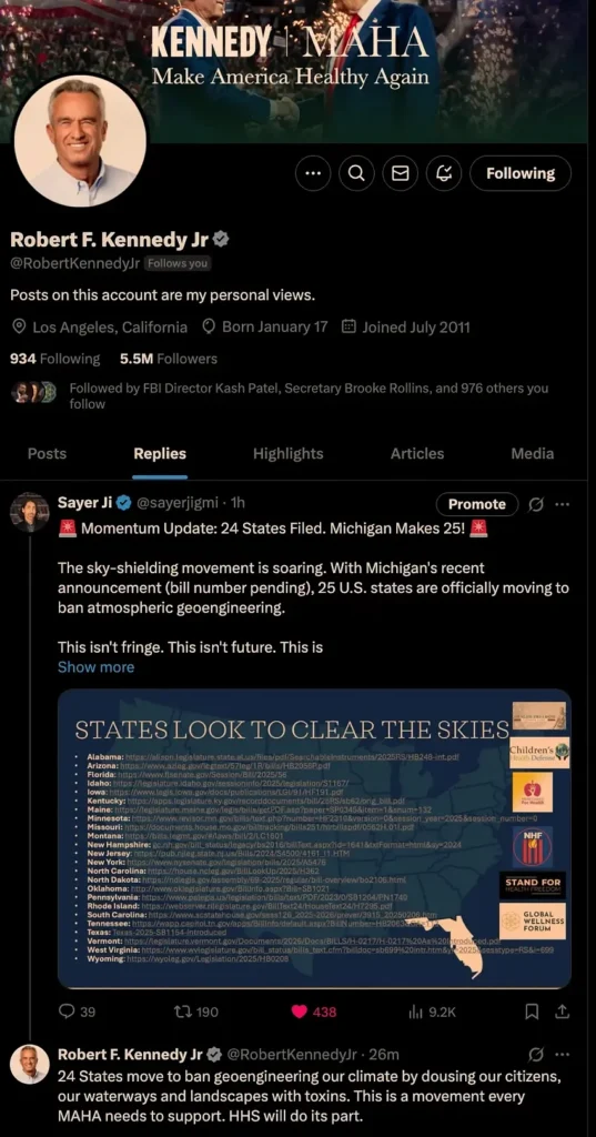 Long dismissed as conspiracy, sky tampering is now officially on the Congressional docket — and it comes riding a wave of unstoppable momentum: from grassroots action and citizen-led state legislation, to rising federal recognition, including a major breakthrough on March 23rd, when Health and Human Services Secretary Robert F. Kennedy Jr.publicly responded to my X post, declaring for the first time Executive Branch support for weather modification bans — fully aligned with the principles of the Make America Healthy Again (MAHA) movement.