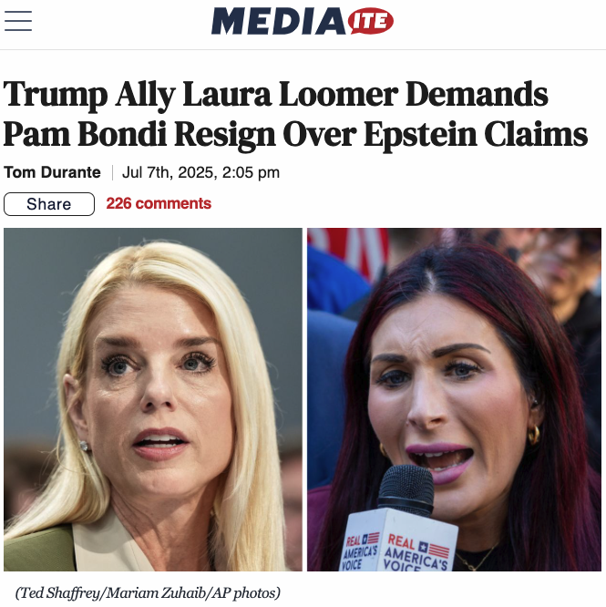 ____ https://www.mediaite.com/media/news/trump-ally-laura-loomer-demands-pam-bondi-resign-over-epstein-claims/