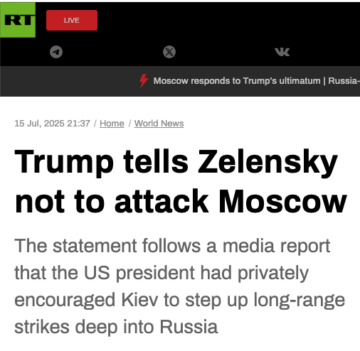 US President Donald Trump said on Tuesday that he told Ukraine’s Vladimir Zelensky not to target Moscow with military strikes. The statement comes in response to media speculation that he had encouraged Kiev to carry out long-range missile attacks deep into Russia.