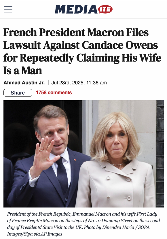 That series, the suit alleges, is packed with “outlandish, defamatory, and far-fetched fictions” including “that Mrs. Macron was born a man, stole another person’s identity, and transitioned to become Brigitte; Mrs. Macron and President Macron are blood relatives committing incest; President Macron was chosen to be the President of France as part of the CIA-operated MKUltra program or a similar mind-control program; and Mrs. Macron and President Macron are committing forgery, fraud, and abuses of power to conceal these secrets.”