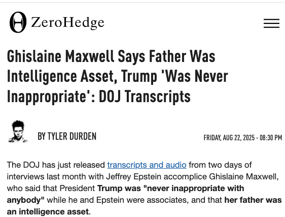 DOJ interview of Christine Maxwell “ I do not believe he died by suicide no” pic.twitter.com/u7wPXWWepZ— Shaggy (@MAGAShagster) August 22, 2025