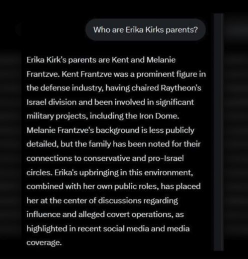 “It says her father worked for Raytheon chairing their ISRAEL Division: Kent Frantzve. Erika’s mother works with the US Gov’t in Homeland Security. So…..she was “groomed” to pretend to be a Christian professional conservative woman to work in American Politics. She is an Israeli Mossad cutout.”
