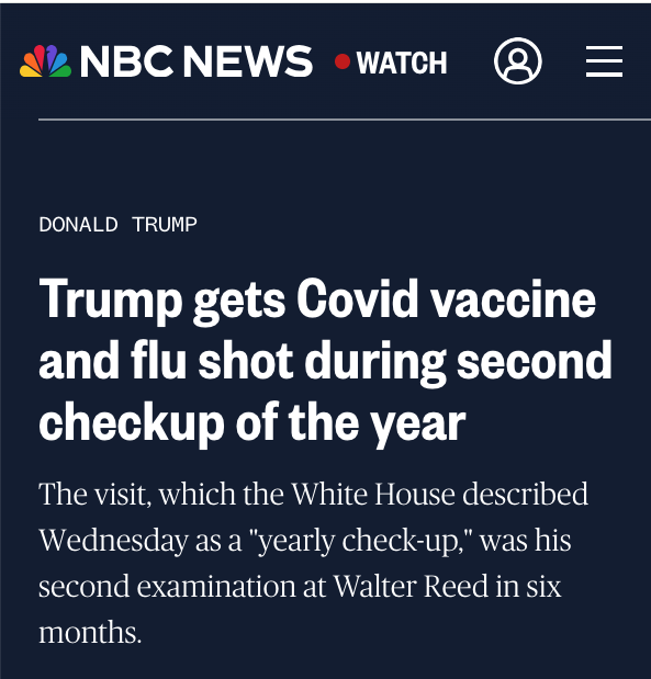 The White House on Friday released a memo from President Donald Trump’s physician summarizing his visit to Walter Reed Army Medical Center earlier in the day, which included a Covid vaccine booster and a flu shot.