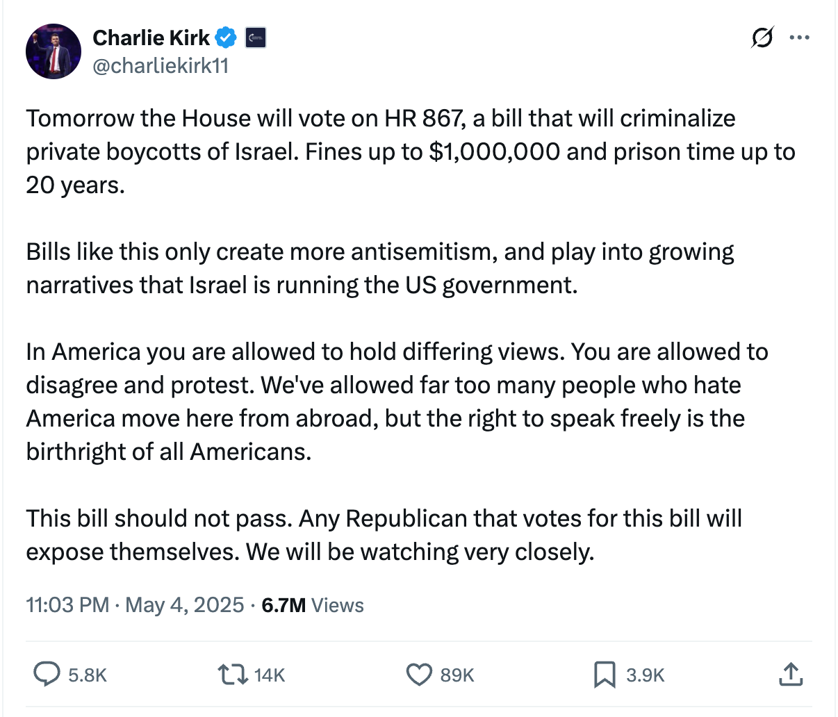 May 4: As Sam Parker has documented, tensions between Charlie Kirk and his pro-Israel backers did not start in July 2025, but at least two months earlier, when Kirk, with tweets viewed up to 8 million times, opposed the ADL’s call for censorship, and contributed to defeat the bill HR 867 that criminalized private boycotts of Israel.