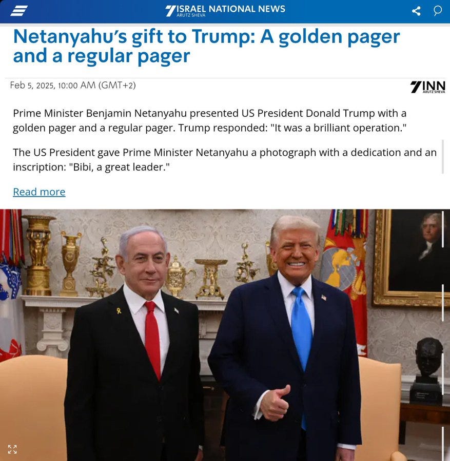 Perhaps the most telling sign of the true nature of the relationship between Netanyahu and Trump came on February 6, 2025, when Netanyahu offered Trump a golden pager, as a trophy or souvenir of Israel’s pager attack on Hezbollah members in Lebanon, September 23, 2024—a repellant form of International terrorism contrary to every international law. Trump accepted the gift, commented that “It was a brilliant operation,” and dedicated a photograph of himself with the inscription “Bibi, a great leader.”