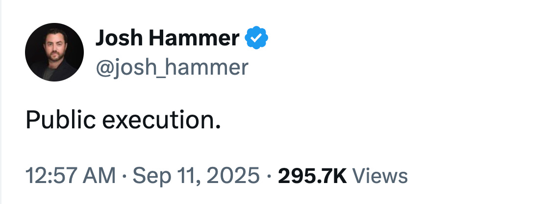 Sept 10: Three hours after Kirk’s death, Hammer again cryptically tweeted: “public execution,” echoing his tweet of the day before, suggesting that he was cryptically taking responsibility for Kirk’s assassination.