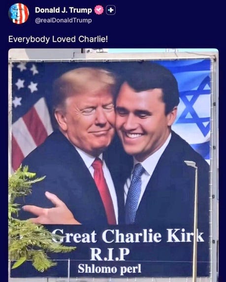 Considering that Kirk considered himself a friend of Trump, whom he has supported wholeheartedly since 2016, many people have been disturbed by Trump’s behavior after Kirk’s assassination, when he was seen enjoying himself at a baseball game the day after Kirk’s assassination, or changing the subject when presented with condolences two days later, or posting an IA-generated photo of him and Charlie on the background of both the American and Israeli flags, with a cryptic caption.