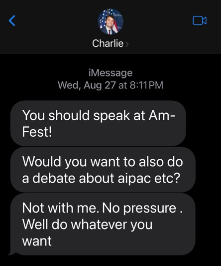 The next day, August 6: in a live exchange with Megan Kelly, Kirk complained of the “repulsive” ways he was treated, naming Josh Hammer in particular, and stating that, as executive director of TPUSA, “I have less ability… to criticize the Israeli government than actual Israelis do. And that’s really, really weird.”