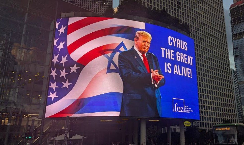 Not just Netanyahu, but most Israelis love Trump, according to Trump’s arch-Zionist ambassador to Israel Mike Huckabee, who said several times that criticizing Israel in his presence is like criticizing his wife: “If Donald Trump were on the ballot in Israel,” Huckabee said, “he would get 95% of the vote!” Remember when, in May 2018, commenting on Trump’s decision to move the American embassy to Jerusalem, Netanyahu declared that Trump was the equivalent of Persian emperor Cyrus 2500 years ago (hailed as God’s anointed in Isaiah 45:1-5). Well, here we go again: as Trump was about to land in Israel this October 13, billboards appeared in Tel Aviv hailing him as the resurrection of Cyrus the Great:
