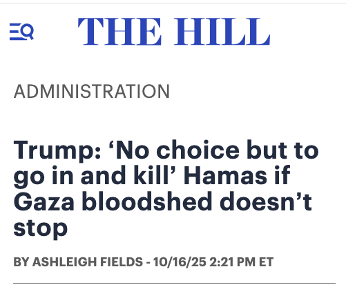 “If Hamas continues to kill people in Gaza, which was not the Deal, we will have no choice but to go in and kill them. Thank you for your attention to this matter!” the president posted on Truth Social.