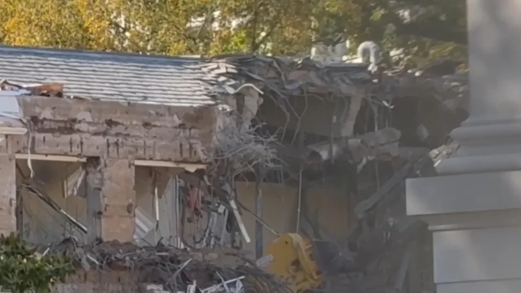 WASHINGTON, DC – OCTOBER 22: The facade of the East Wing of the White House is demolished by work crews on October 22, 2025 in Washington, DC. The demolition is part of U.S. President Donald Trump’s plan to build a ballroom reportedly costing $250 million on the eastern side of the White House. (Photo by Anna Moneymaker/Getty Images)