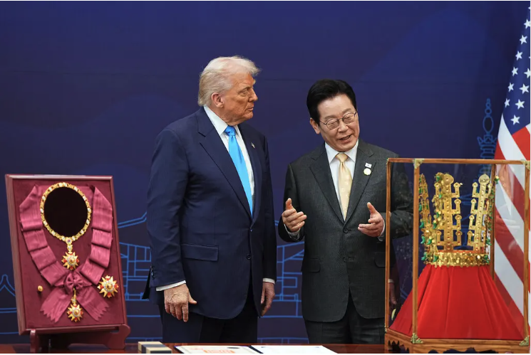 During the ceremony at the Gyeongju National Museum, Mr. Trump shook hands with Mr. Lee and thanked him for the gift, saying it was “very special.”