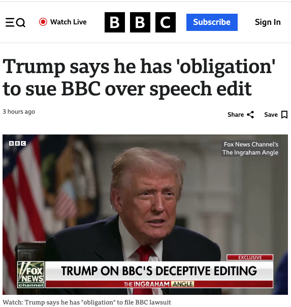 US President Donald Trump has said he has an “obligation” to sue the BBC over the way a section of his speech was edited in a Panorama documentary.