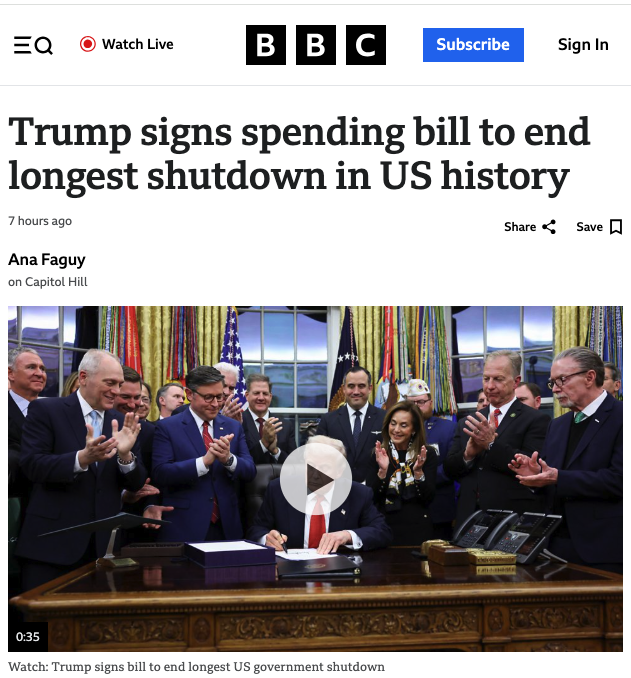 Many government services have been suspended since October, and around 1.4 million federal employees have been on unpaid leave or working without pay. Food aid has also been left in limbo and air travel has been disrupted nationwide.