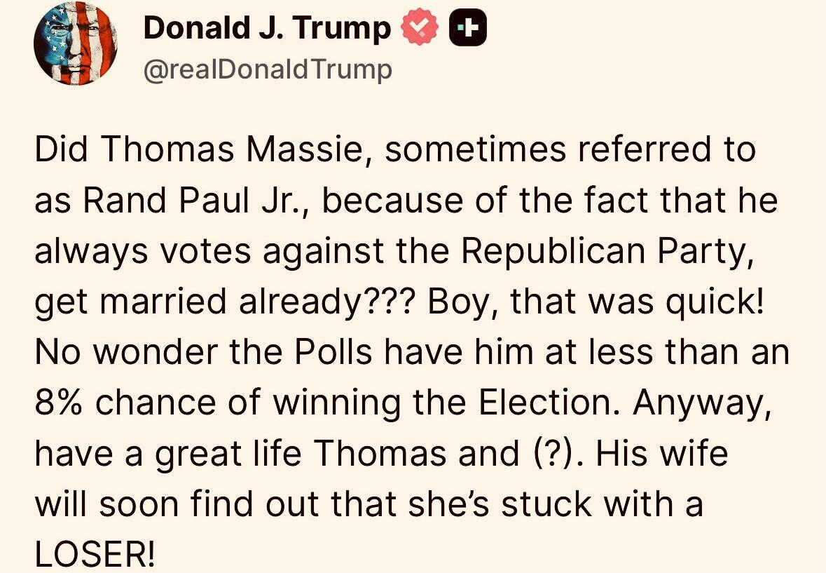 Donald Trump just attacked Thomas Massie for getting re-married recently after his wife tragically passed away last year.
