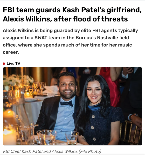 The FBI confirmed Monday that it has assigned a protective security detail to country singer Alexis Wilkins — the longtime girlfriend of FBI Director Kash Patel — after she received hundreds of death threats tied to their relationship.
