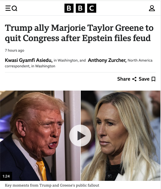 She said in her video statement, posted on social media, that she would leave the US Congress on 5 January 2026.