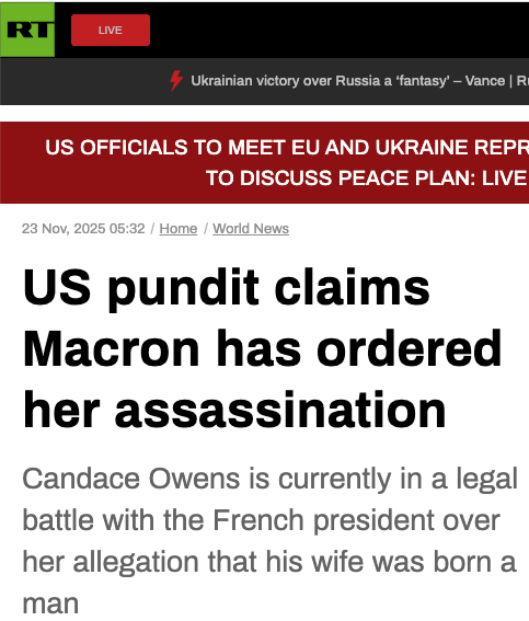 In a post on X on Friday, Owens said she had been contacted by “a high-ranking employee of the French government,” who claimed that “the Macrons have executed upon and paid” for the assassination of both her and French journalist Xavier Poussard.