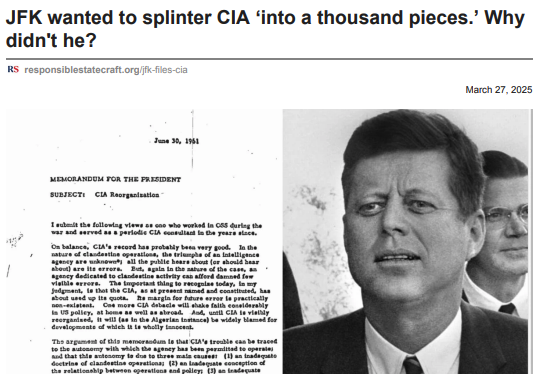 (2) JFK vowed to shut down the CIA shortly after the failed Bay of Pigs operation. The CIA is the granddaddy of all black ops and psyops around the world, including all major terrorist events before and since 911. With such an enormous and unaccountable black budget funding so many illegal schemes, JFK understood the CIA was the proverbial loose canon. His firing of CIA Director, Allen Dulles, proved to be the last straw. So was his vow to “splinter the CIA into a thousand pieces and scatter it into the winds”.
