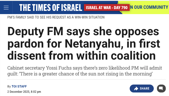 https://www.timesofisrael.com/deputy-fm-says-she-opposes-pardon-for-netanyahu-in-first-dissent-from-within-coalition/