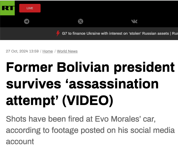 The caption says that the former president was about to go on his usual Sunday routine when his vehicle was intercepted by two cars in the central Bolivian town of Shinahota early in the morning. Four hooded people dressed in black emerged from the cars and opened fire on the ex-president’s vehicle, it claims.