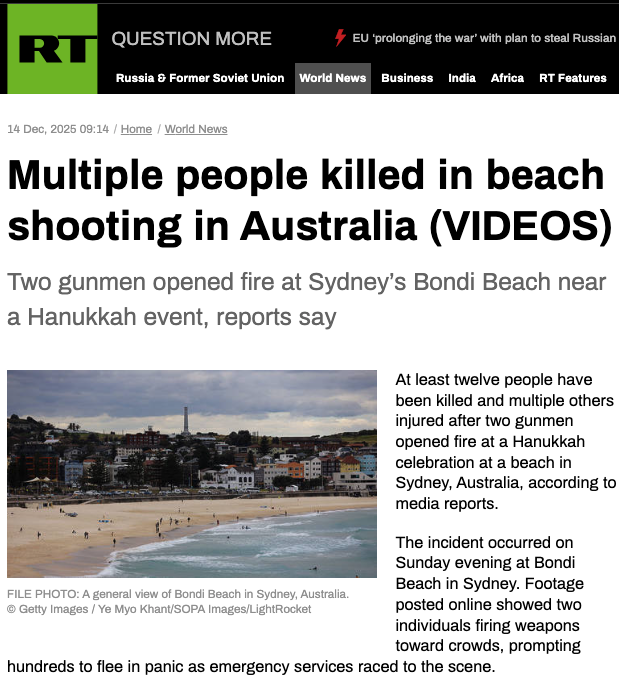 This alleged mass shooting at Bondi Beach “will be used to attack, arrest and harass anyone who criticizes Israel in Australia”. — Posted by .o0o.