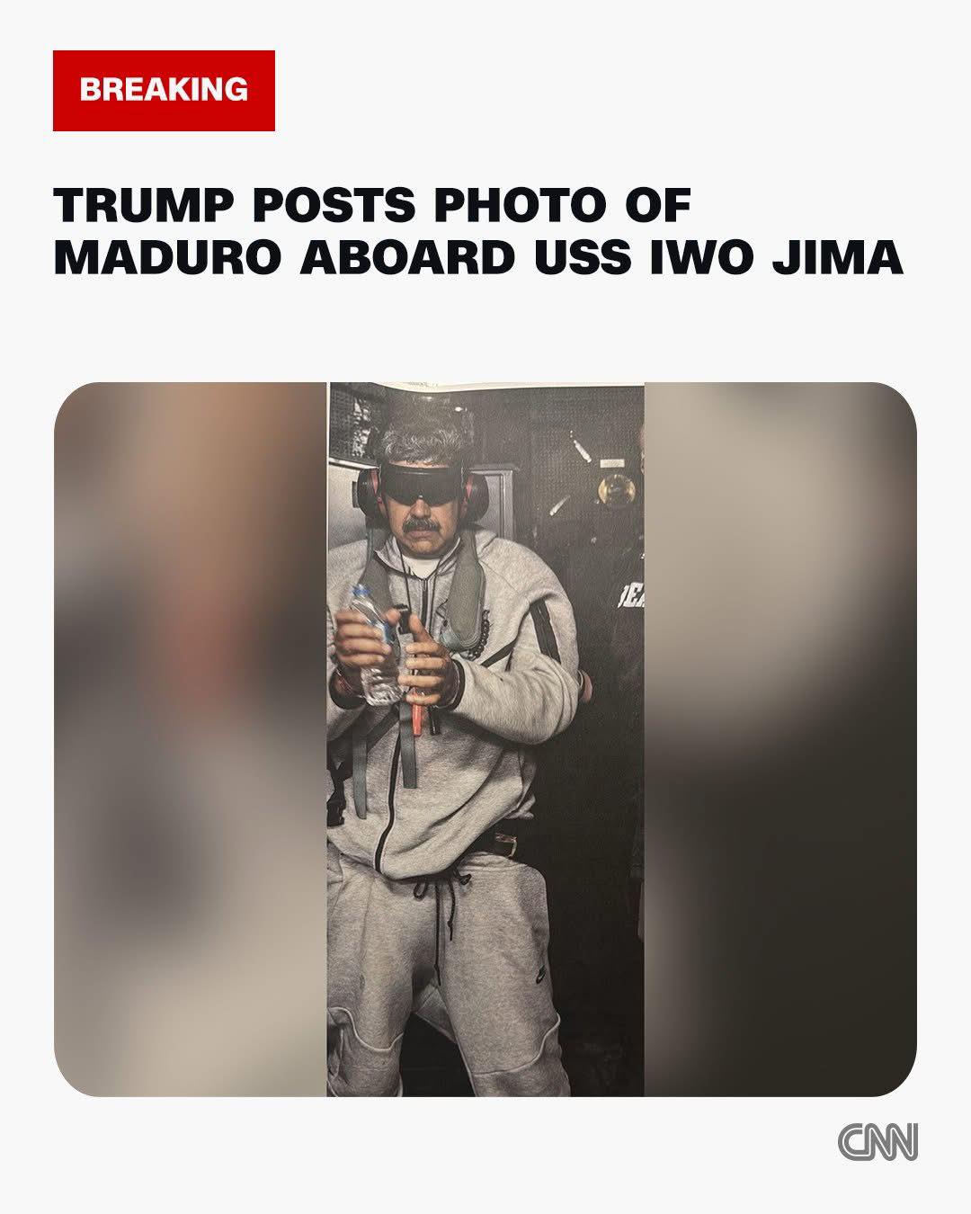 PHOTO: Maduro and his wife Cilia Flores were dragged from their bedroom by elite US forces during the raid where he was handcuffed, blond-folded, kidnapped and then taken to the USS Iwo Jima.