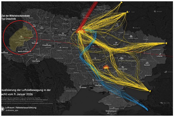 Notice the red line, a single line heading out to Lviv, which was a launch of a Russian “Oreshnik” ICBM. That single missile impact vented then started a fire in the largest natural gas underground storage facility in all of Europe; Seventeen Billion Cubic Meters of natural gas is now burning-off, out of control, in LVIV.