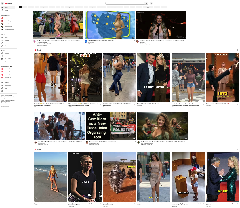 What follows is a screenshot of YouTube’s home page. These are the thumbnail photos of the videos and shorts that now routinely populate the top of the YouTube home page. How long before the Alphabet cultural marxists press the button on graphic soft porn?