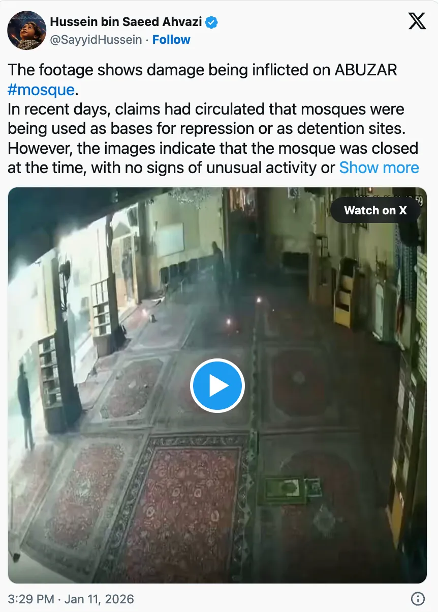 In Tehran, meanwhile, mobs of rioters have attacked the historic Abazar Mosque, burning its interior, while others conducted arson attacks and burning copies of the Quran inside the Grand Mosque of Sarableh and the Muhammad ibn Musa al-Kadhim shrine in Kuzestan.