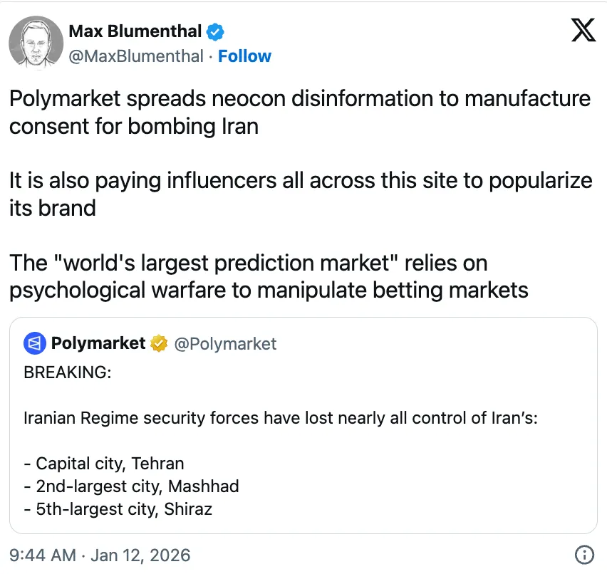 The digital casino Polymarket also inflated the death toll, claiming without sourcing that “over 10,000” people had been killed by “Iranian Forces [using] Automatic Rifles on Protesters,” and falsely stating that Iran had “lost nearly all control” of three of its five largest cities.”
