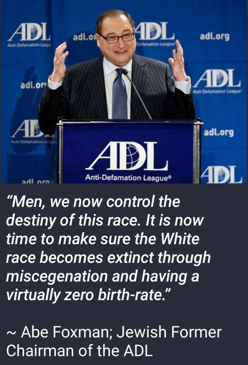 - “Men, we now control the destiny of this race. It is now time to make sure the White race becomes extinct through miscegenation and having a virtually zero birth rate.” — Ex-ADL Jewish Chairman Abe Foxman