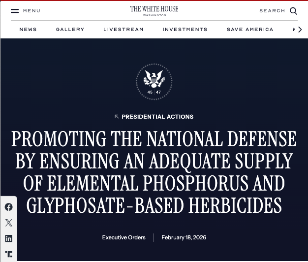 Section 1. Policy and Findings. Elemental phosphorus is pervasive in defense supply chains and is therefore crucial to military readiness and national defense. It is a key input in smoke, illumination, and incendiary devices and is a critical component for manufacturing the semiconductors that are central to numerous defense technologies, such as radar, solar cells, sensors, and optoelectronics. It is also increasingly important in modern lithium-ion battery chemistries used in a multitude of weapon-system supply chains. For these and other reasons, on November 7, 2025, the Department of the Interior, acting pursuant to the Energy Act of 2020, designated phosphate as a critical mineral.